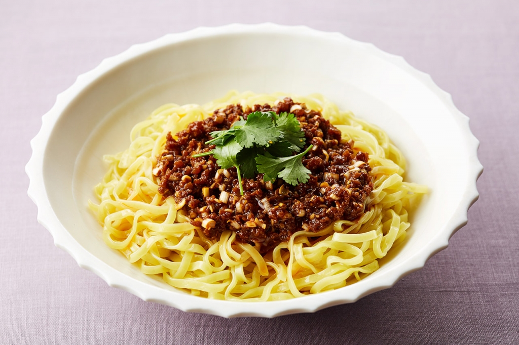 - フライパンに油を熱し、豚ひき肉を入れて、色が変わりパラパラになるまで炒めたら、ねぎとたれを加えてさっと炒め合わせる。
