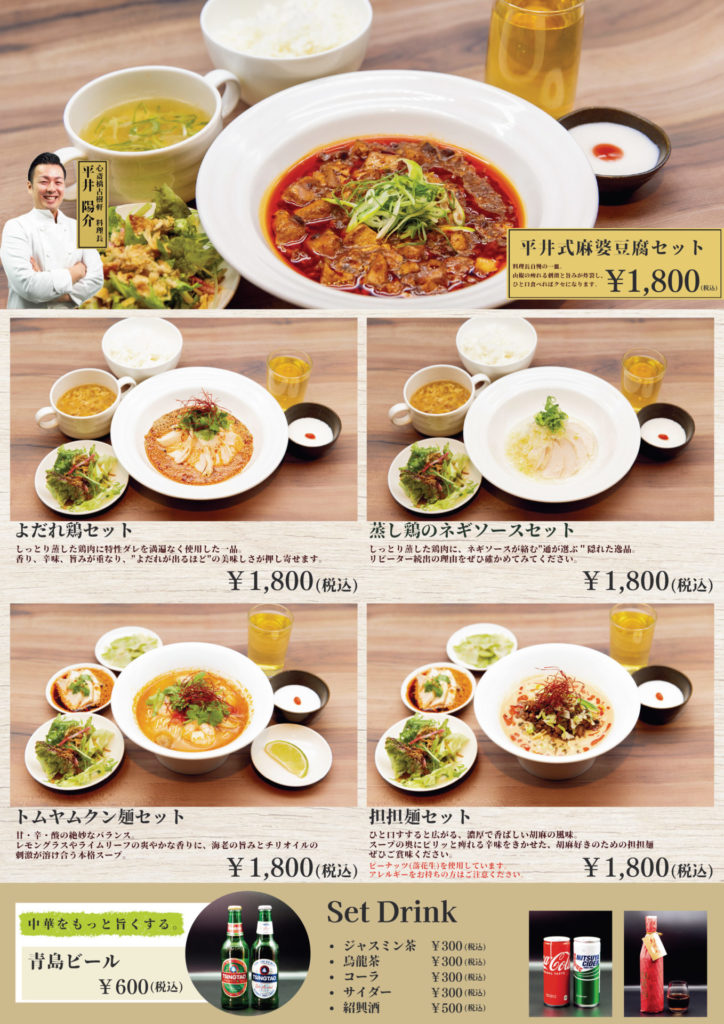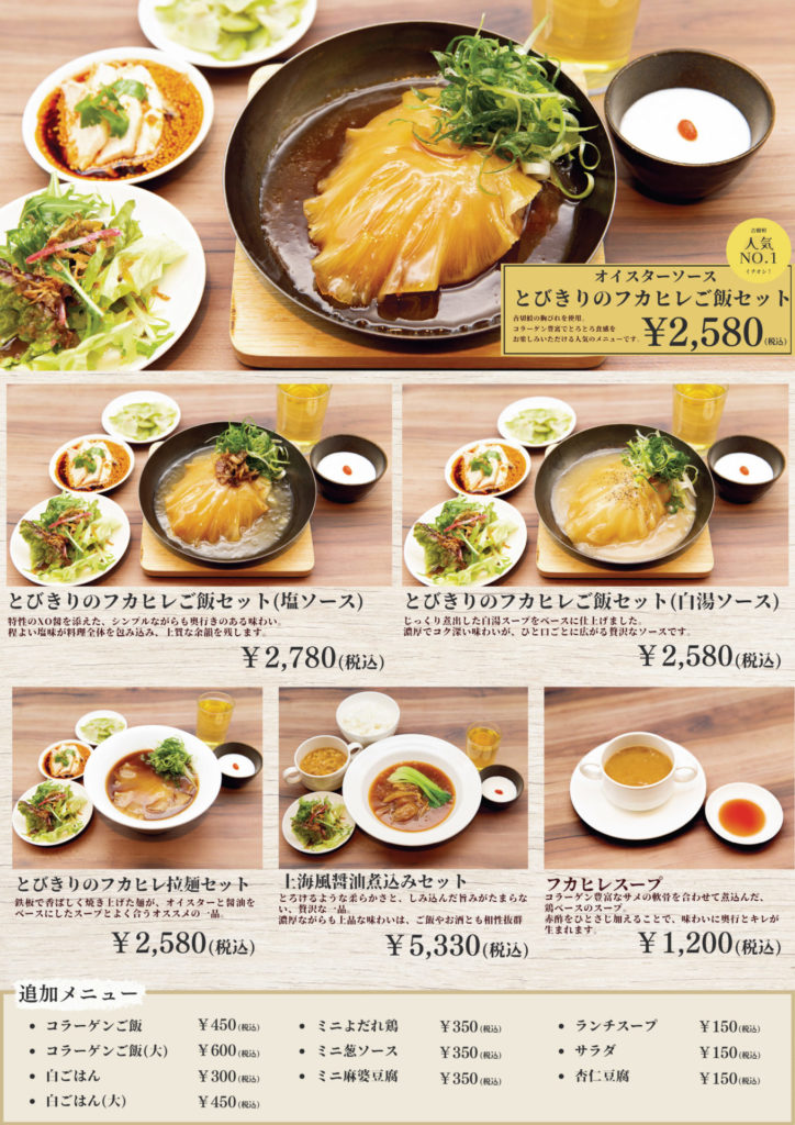 宮城県気仙沼市の自社施設で加工された、フカヒレのどんぶりや麺料理が一押し。上質な鶏スープにオイスターエキスをきかせた定番の醤油煮込みの味つけで、フカヒレの魅力を、メーカーだから実現できる価格で楽しめます。軽くつまめる中華の前菜や点心などメニューも充実。